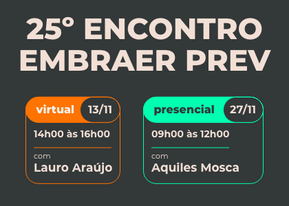 Notícias Encontro EMBRAER PREV de Novembro 31/10/2025 O Encontro da EMBRAER PREV – Educando para um Futuro Melhor – é uma iniciativa da EMBRAER PREV para que você saiba mais sobre educação previdenciária e financeira e acompanhe os resultados de... Leia mais